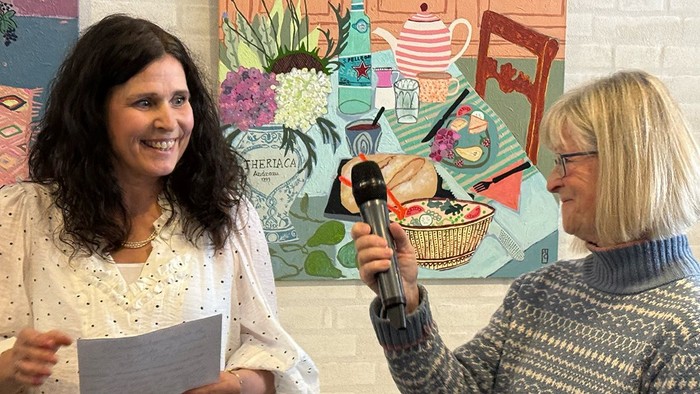 UDSTILLING i Præstegårdsladen. På fotoet overrækker Marianne Rygh, formand for kunstudvalget, mikrofonen til kunstner Annette Carlsen, der holdt en tale for de fremmødte til ferniseringen i Præstegårdsladen d. 21. februar 2026.