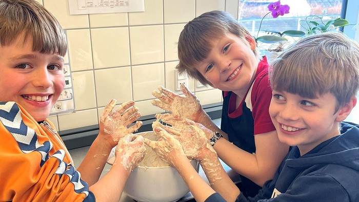 Herunder ses et foto med 3 minikonfirmander i gang i køkkenet i Præstegårdsladen.